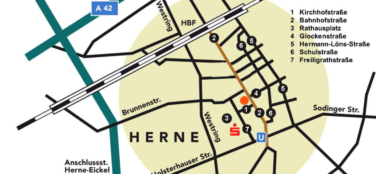 Unser Büro in Herne ist über den Hbf Bochum mit Anschluss an die U-Bahnlinie 35 (Richtung Herne Strünkede) zu erreichen. Die U-Bahnhaltestelle Kreuzkirche/ Archäologie-Museum in Fahrtrichtung zum Ausgang Bahnhofstraße verlassen. Folgen Sie der Bahnhofstraße (Fußgängerzone), bis Sie nach 250m die von links einmündende Kirchhofstraße erreicht haben. Nach weiteren 100m finden Sie unser Büro auf der rechten Seite (Zufahrt Tiefgarage). Über den Hbf Herne erreichen Sie unser Büro ebenfalls über die Bahn.