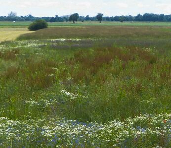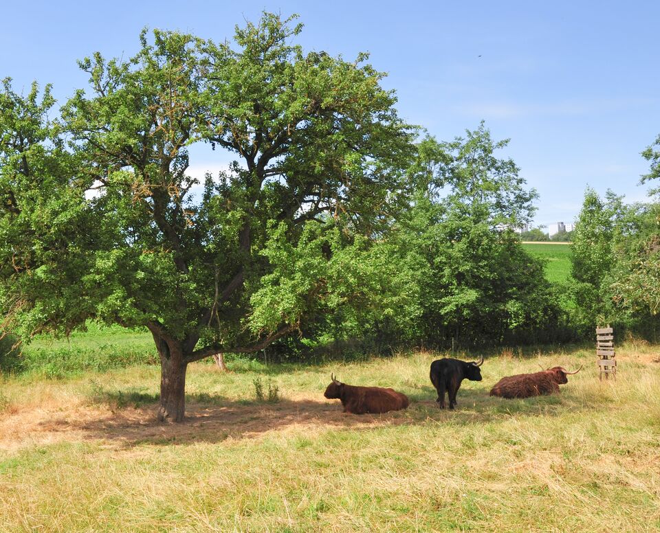 Aufgabenstellung: Revitalisierung von Streuobstbeständen (Neupflanzung alter Sorten, extensive Beweidung), Anlage eines naturnahen Fließgewässers mit gewässerbegleitenden Gehölzen und Röhrichten sowie von xerothermen Lebensräumen